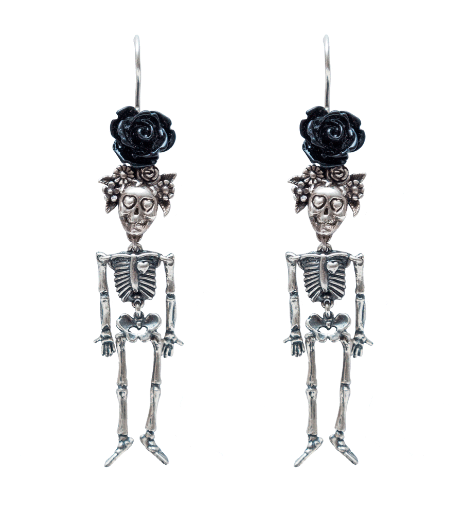 Aretes de arillo de calaca con extremidades móviles con flor negra.