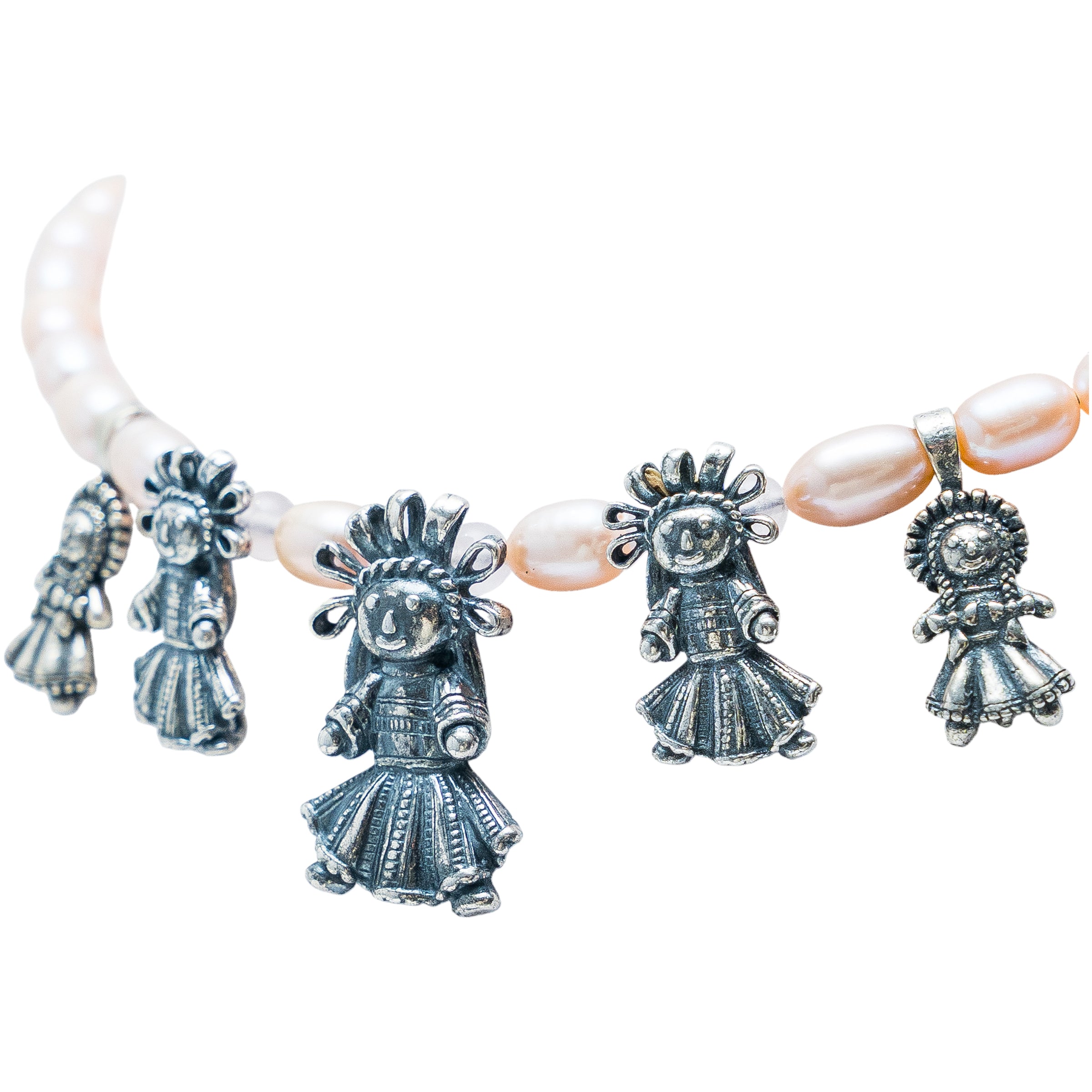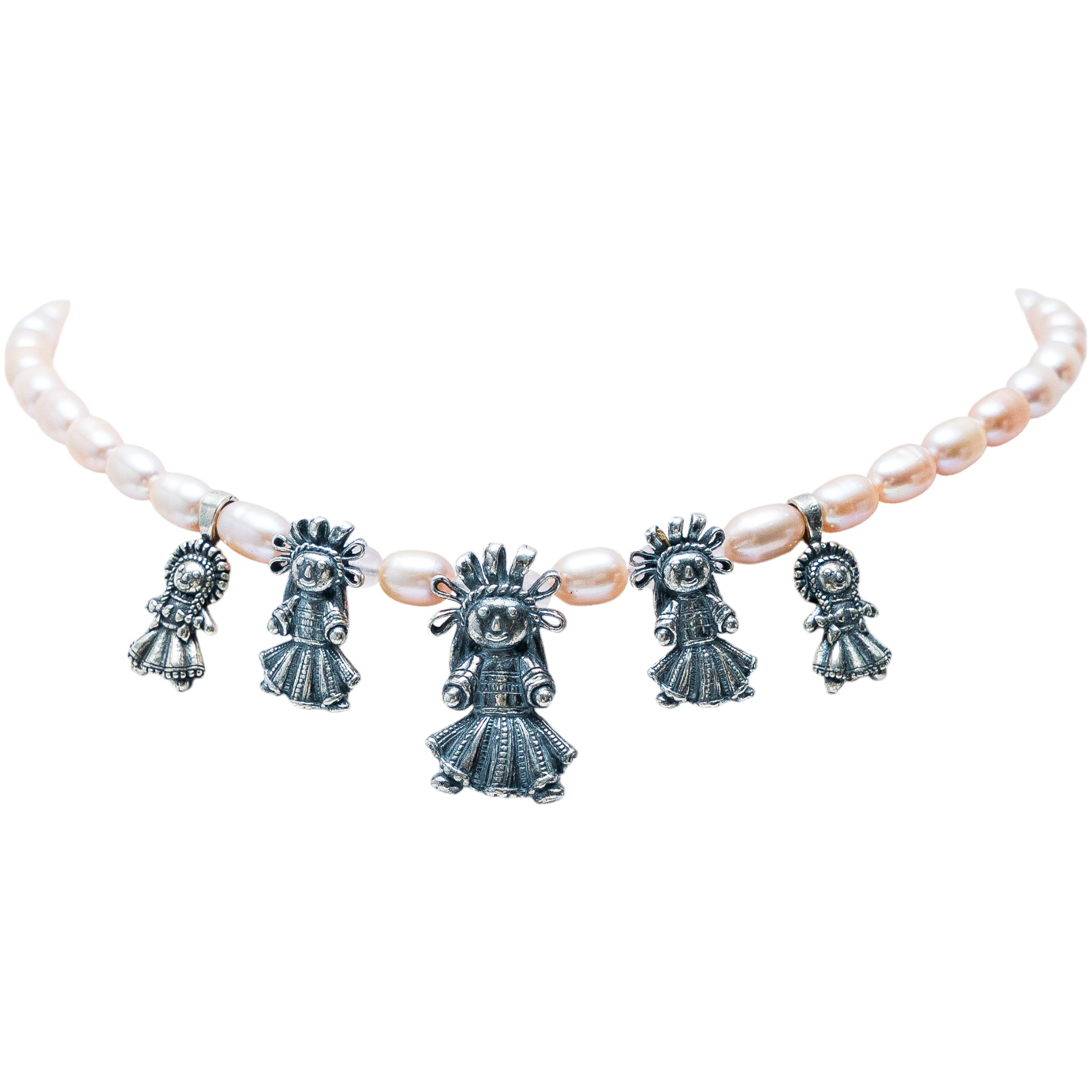 Collar formado por un hilo de perla ovalada con tonalidad rosa complementado con dijes como: 1 muñeca de listones mediana, 2 muñecas de listones chicas y 2 muñecas de listones mini.