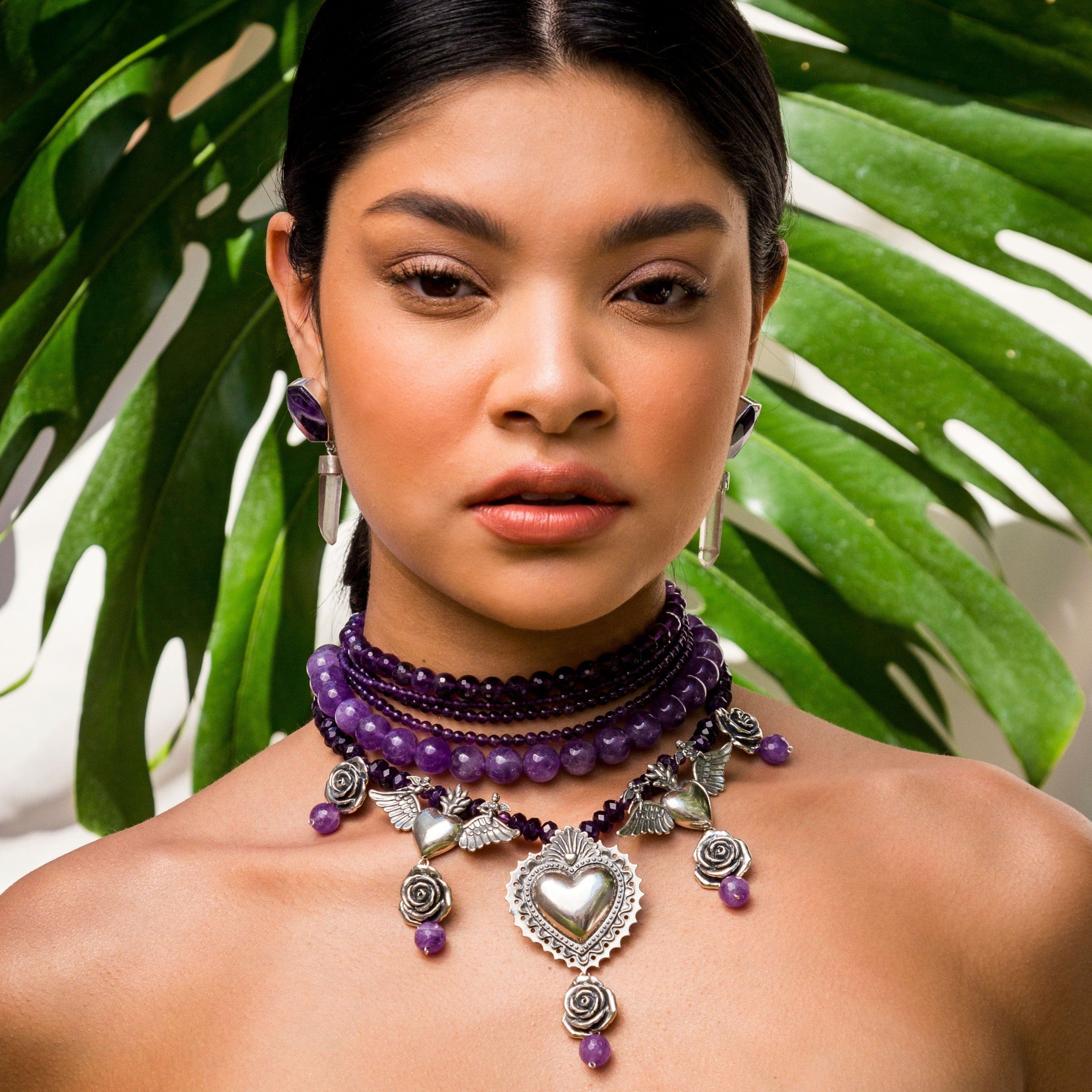 Piezas Plata: 5 Rosas Medianas, 2 Corazones con Alas y Querubines, 1 Corazón Bordado. Hilos: Gemas: 7 hilos de amatista con variación de tamaños.