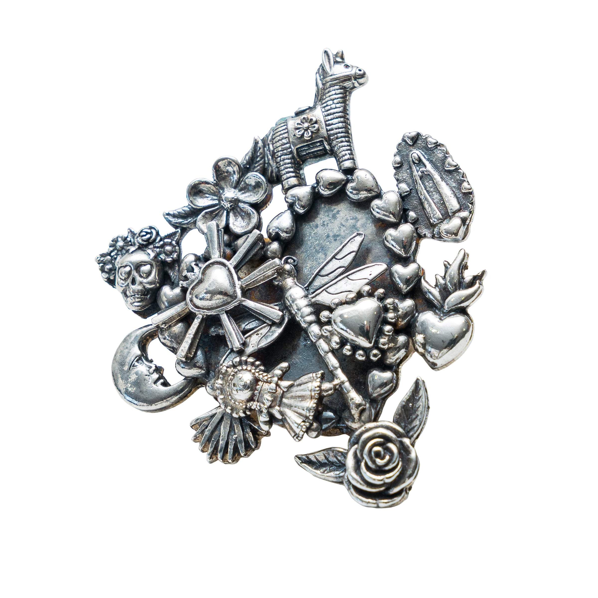 Anillo ajustable conformado por: una piñata burrito, una flor jarrito, una cabeza calaca Frida, un corazón resplandor chico, una luna, una virgen corazones mini, una muñeca de listones mini, un agave sueño 2, una libélula hacienda, un corazón con puntos chico, un corazón con flama chico, una rosa calavera y una guía de corazones.