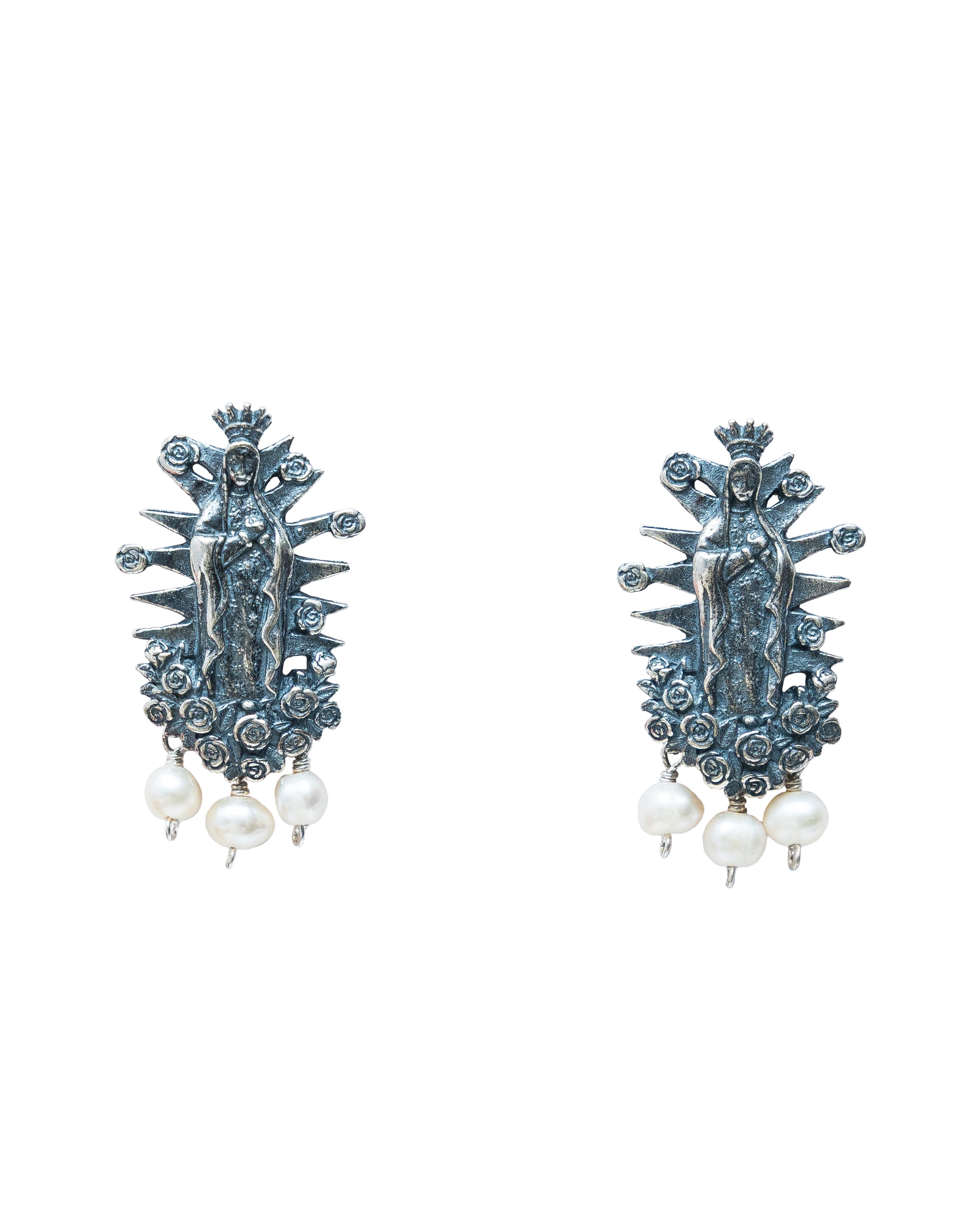 Aretes Virgen con rosas poste 3 perlas
