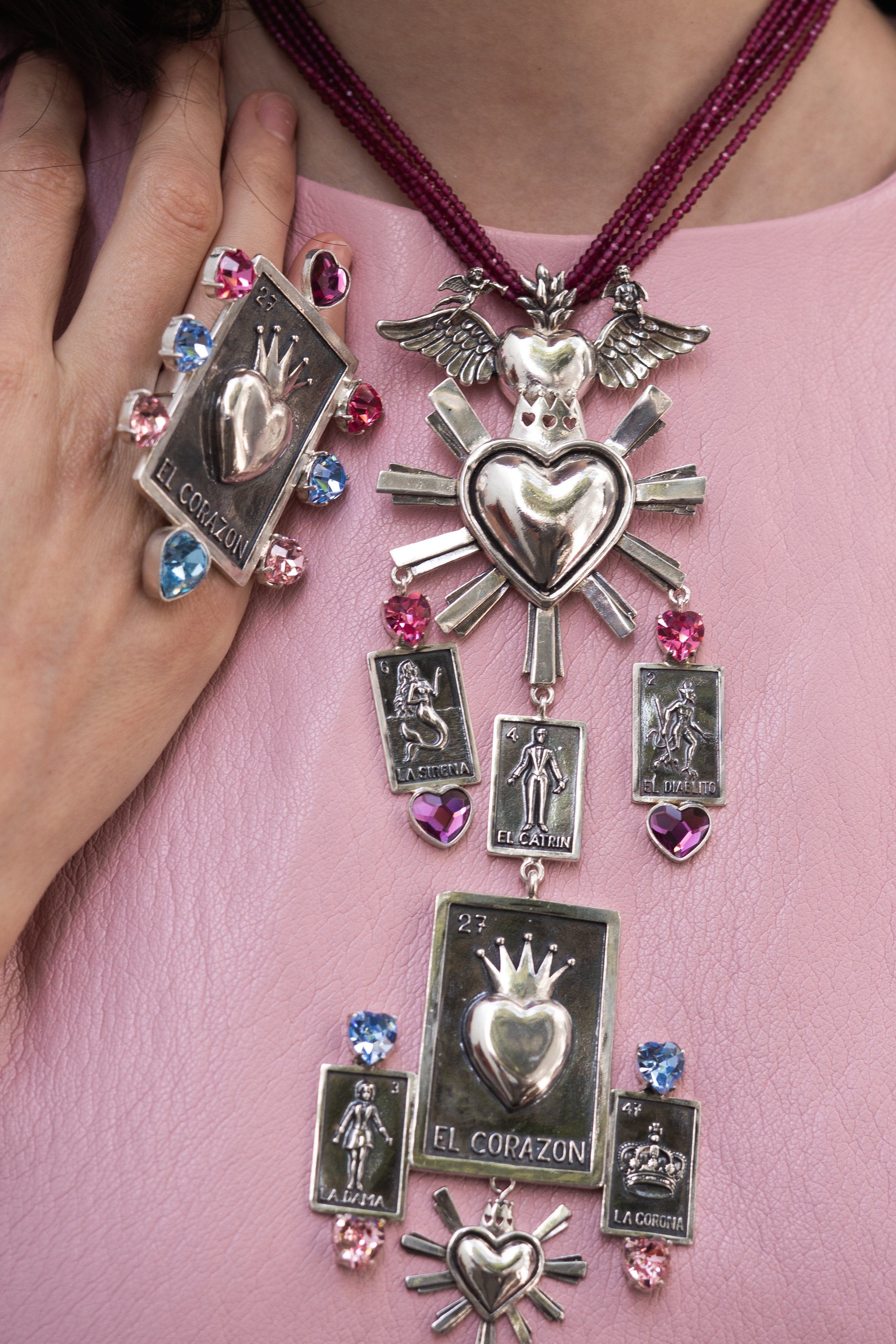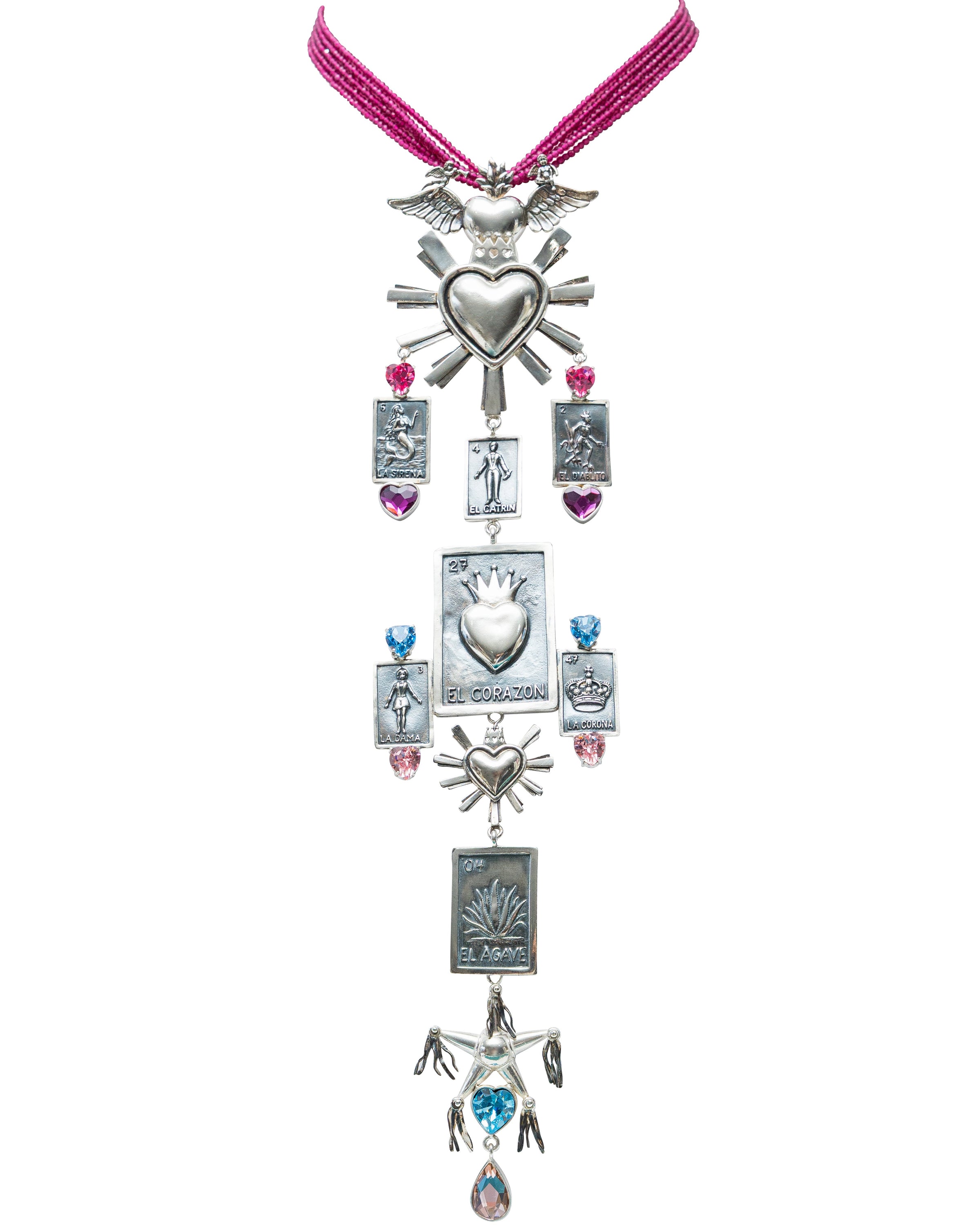 Un dulce bocado de elegancia tapatía. El collar Turrón Rosa de Guadalajara es una pieza que celebra la alegría explosiva de nuestras plazas y el glamour de nuestra herencia. Como un racimo de dulces recuerdos, esta cascada maximalista de plata mexicana entrelaza el brillo de la piñata, el latido del corazón y la mística de la lotería.